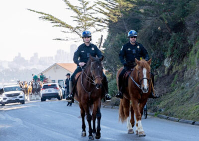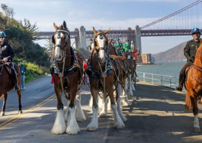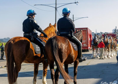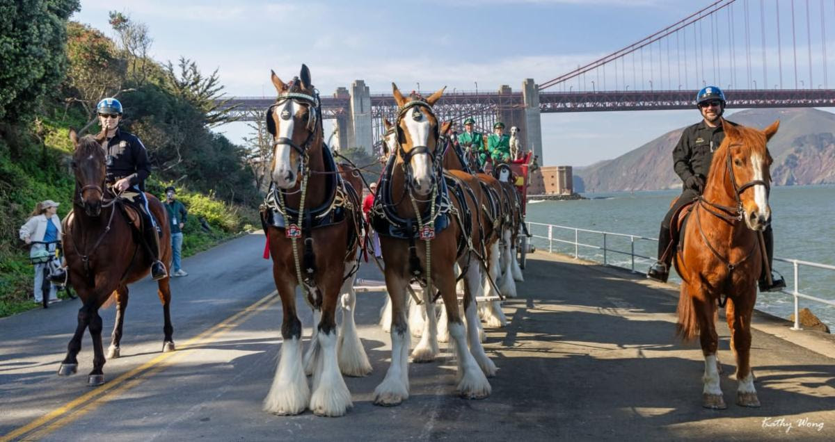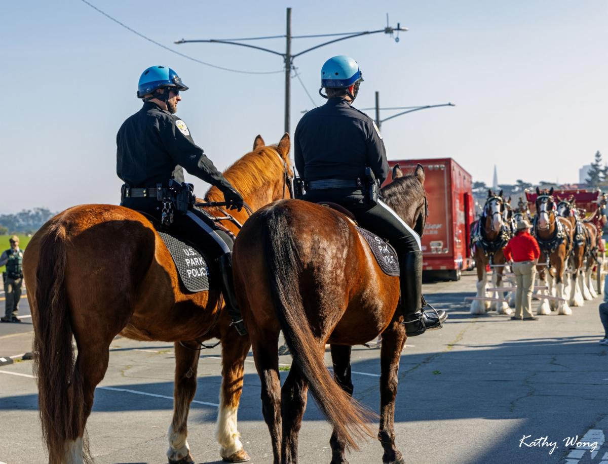 The Presidio and the Golden Gate National Recreation Area assisted Anheuser-Busch and their gorgeous team of Clydesdales do a ceremonial beer delivery at Fort Point! Several U.S. Park Police and National Park Service Rangers assisted the event, among them were two of our San Francisco Field Office Horse Mounted Patrol officers, Capt. Griess riding Rhett (short for Rhett Butler, of course) and Ofc. Gordiejew on Samson (the very handsome chestnut giving the Clydesdales the side eye).